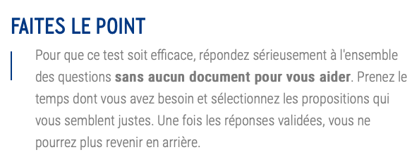 Un exemple parfait avec cette collection qui propose un auto-test en début de livre. En bonus, certains titres vous proposent un cours ou rafraichissement complet des connaissances !