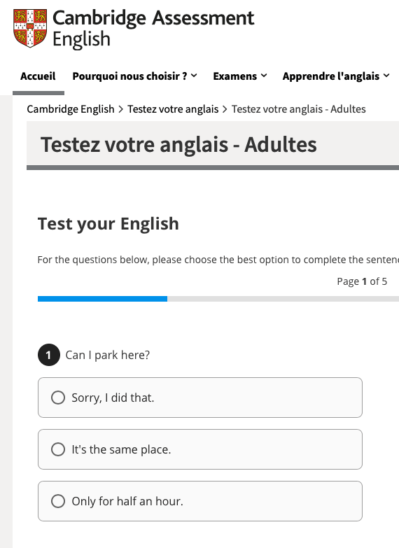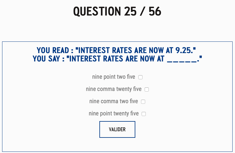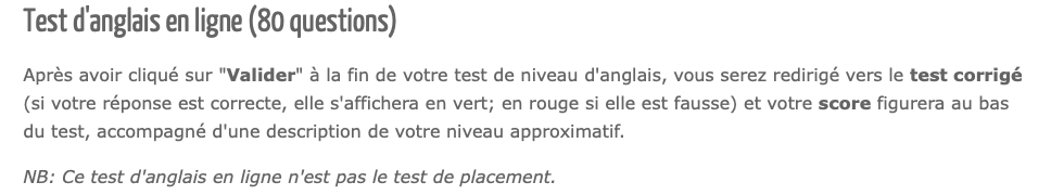 Ce test d’anglais est de 56 questions le plus souvent ardues, donc n’allez pas trop vite et prévoyez du temps. Vous pouvez aussi l’interrompre et le reprendre au même endroit un autre jour. Bien fait, il permet de ressentir vos manques sans être une vraie prise de tête.