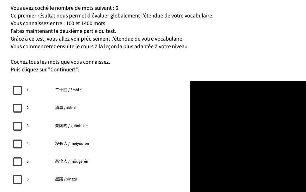 Un test de vocabulaire à passage de niveaux par pallier continu et dont l’autre originalité est de voir les réponses à tout moment dans le cadre noir en survolant avec la souris. Le truc est de cocher si vous pensez savoir et vérifier après. La confiance règne, une autre approche d’un test rarement vu !