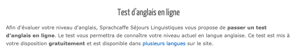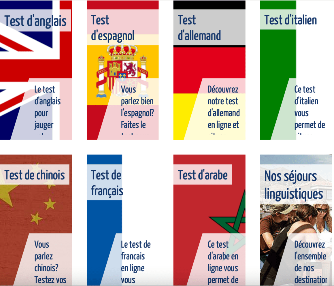 Les tests sont le plus souvent en France cantonnés à quelques langues avec en tête l’anglais, ce qui en dit long sur l’état de la France dans le domaine des langues étrangères, de ses capacités à l’export et de l’ouverture sur le monde réel… Seuls les sites de séjours linguistiques, en toute logique, sortent de l’obscurantisme ambiant.