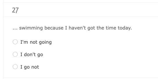 Un test assez long de 80 questions avec une difficulté progressive très axé en anglais sur les trucs avec apostrophes 🙂 . Prendre son temps avec les pièges de la conjugaison anglaise en mode champ de mine… Images de quelques questions :