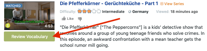 Notons le bouton « vocabulaire » (pour rĂ©viser avant du vocabulaire d’une nouvelle vidĂ©o) que l’on peut voir pendant la recherche ou trouver dans « games ». Le vocabulaire proposĂ© est ici une sĂ©lection imposĂ©e pour se prĂ©parer Ă l’Ă©coute de la vidĂ©o ou apprendre, diffĂ©rente donc de la fonction « flashcard » principale avec gestion personnalisĂ©e. En rĂ©alitĂ©, le mieux est « d’apprendre ces mots » avant la lecture de la vidĂ©o, ce qui vous aidera pour la comprĂ©hension !