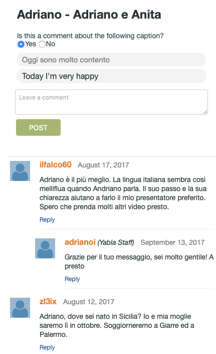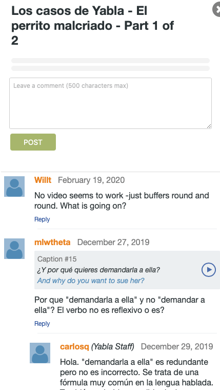 Les commentaires sur la vidĂ©o sont l’occasion de dĂ©couvrir la communautĂ© Yabla mais permettent aussi de poser une question ou de lire des rĂ©ponses (la qualitĂ© des commentaires est trĂšs « variable » mais ils apportent une petite animation sympathique…