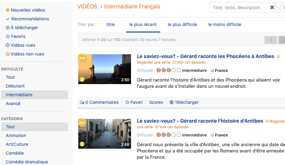 La recherche Ă l’aide d’une liste en pavĂ©s permet de trouver des centaines de vidĂ©os en utilisant des critĂšres de sĂ©lection interactifs avec les niveaux dĂ©part, dĂ©butant, intermĂ©diaire ou avancĂ© (curieusement notĂ© de 1 Ă 5). D’autres comme les catĂ©gories Ă thĂšmes proposĂ©es, les nouveautĂ©s, les dĂ©jĂ visionnĂ©es… permettent d’affiner votre sĂ©lection. Pour ne pas avoir Ă faire dĂ©filer des pages et des pages, cette option est prĂ©cieuse, car trouver les vidĂ©os qui vous plaisent le plus n’est pas Ă©vident en raison de la quantitĂ© ! Le descriptif est aussi un Ă©lĂ©ment dĂ©terminant pour choisir.