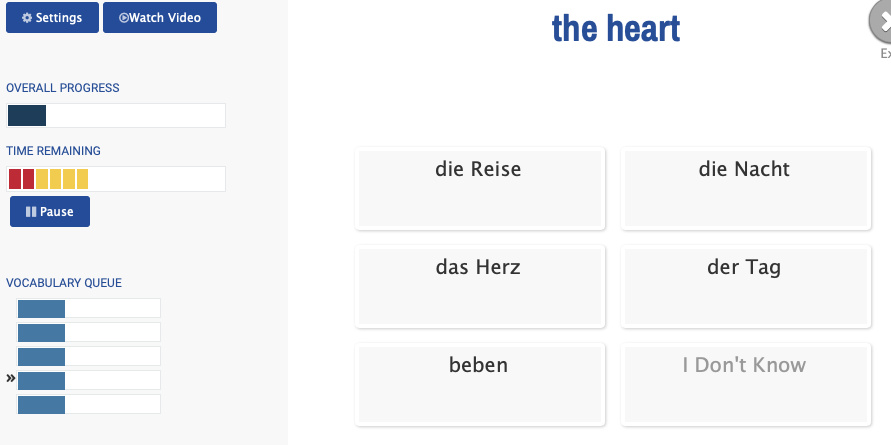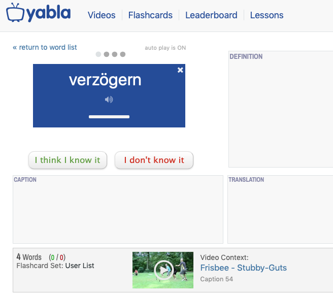 Yabla crĂ©e avec « review » un mini jeu de rĂ©vision pour un groupe choisi de mots issus des vidĂ©os. Vous pouvez opter pendant la rĂ©vision pour « je connais », « je ne connais pas » et confirmer lors de la visualisation de la rĂ©ponse (ce qui permet de garder ou non le mot dans la base). Simple et efficace.