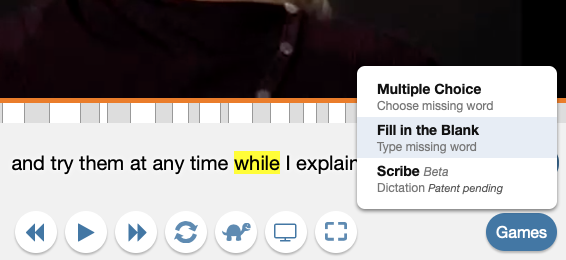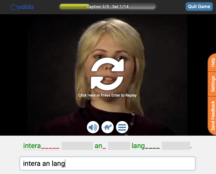 Comme son nom l’indique, il faut Ă©crire ce que l’on entend (vidĂ©o)… Ce dernier demande une prĂ©cision d’orfĂšvre avec les bonnes lettres tapĂ©es qui apparaissent en vert et on s’oriente alors vers un jeu du type « le pendu » pour complĂ©ter la phrase. On a toutefois la bonne rĂ©ponse en cliquant sur les espaces manquants. RĂ©clame une Ă©coute soutenue, mais nous fait retomber un peu beaucoup dans l’Ă©crit et casse le rythme, mĂȘme si un trĂšs astucieux systĂšme de couleurs montre la progressivitĂ© des bonnes rĂ©ponses avant de valider (si le texte apparait en vert, c’est la bonne rĂ©ponse, les autres couleurs exprimant le type d’erreur). DifficultĂ© aussi avec l’argot, les prononciations locales diffĂ©rentes ou des sĂ©ries avec langage parlĂ©. IngĂ©nieux, mais ne semble pas en phase avec l’immersion vivante d’esprit Yabla Ă notre avis…