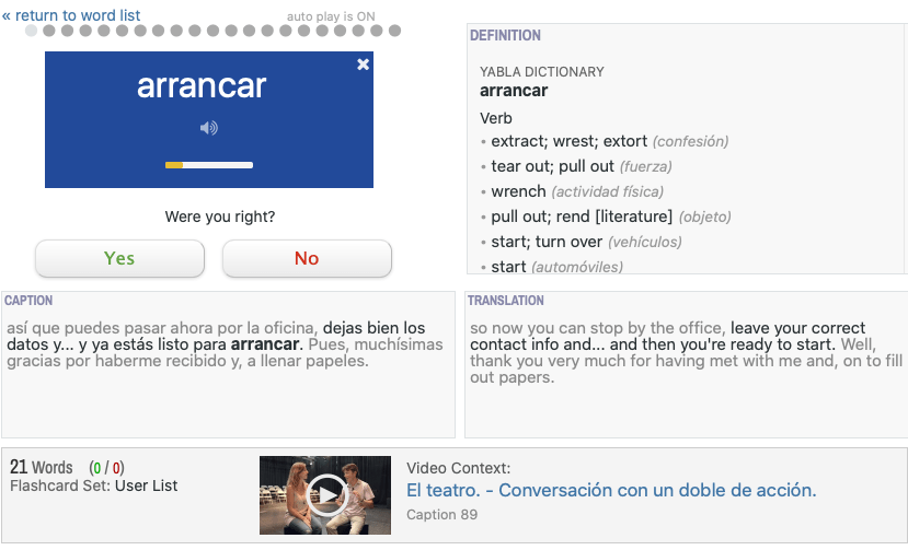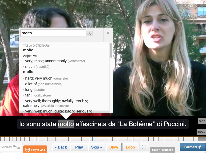 Yabla, jeu de mot avec le verbe espagnol hablar (parler), est un outil simple Ă premiĂšre vue, mais terriblement efficace. Il est le chaĂźnon manquant de beaucoup de logiciels d’apprentissage des langues Ă©trangĂšres pour une Ă©coute et une immersion dans la vraie vie.