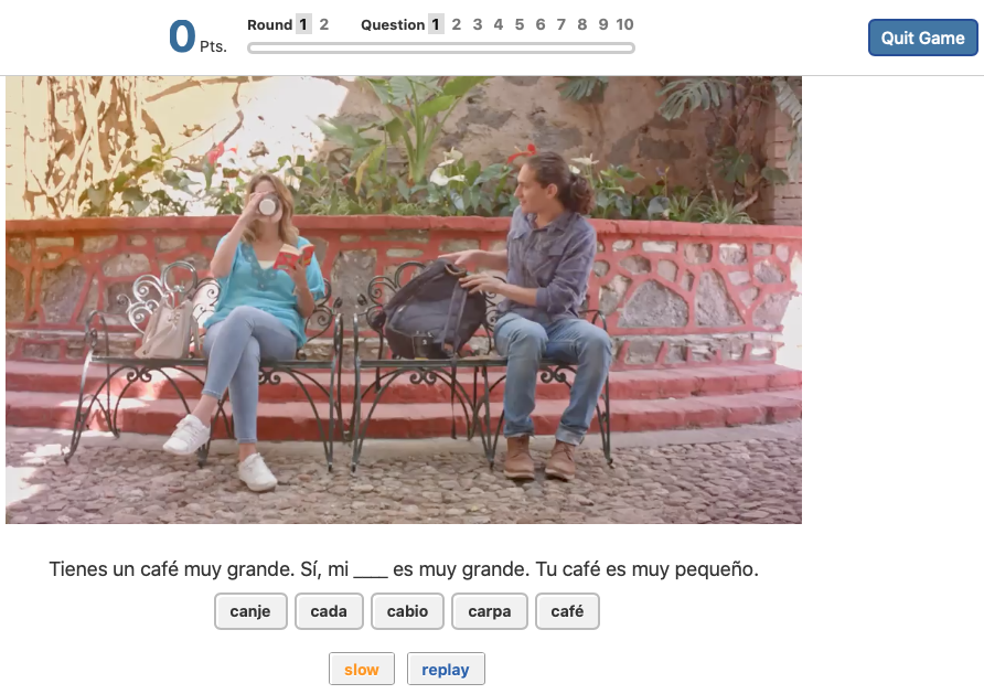 Encore un truc astucieux : les cases dĂ©finition, traduction et contexte de capture n’apparaissent que si vous cliquez dessus pour vous permettre de rĂ©flĂ©chir et de voir les infos dĂ©taillĂ©es ou pendant la vĂ©rification. Le slow ou la sortie maintenant permet de ralentir l’Ă©coute. Plusieurs vitesses sont proposĂ©es et cette option permet un premier passage pour Ă©tudier ou Ă©couter une vidĂ©o d’un niveau un peu Ă©levĂ©. Ensuite on peut réécouter Ă vitesse normale. Un peu pourrie toutefois la formule lente pour les chansons đ