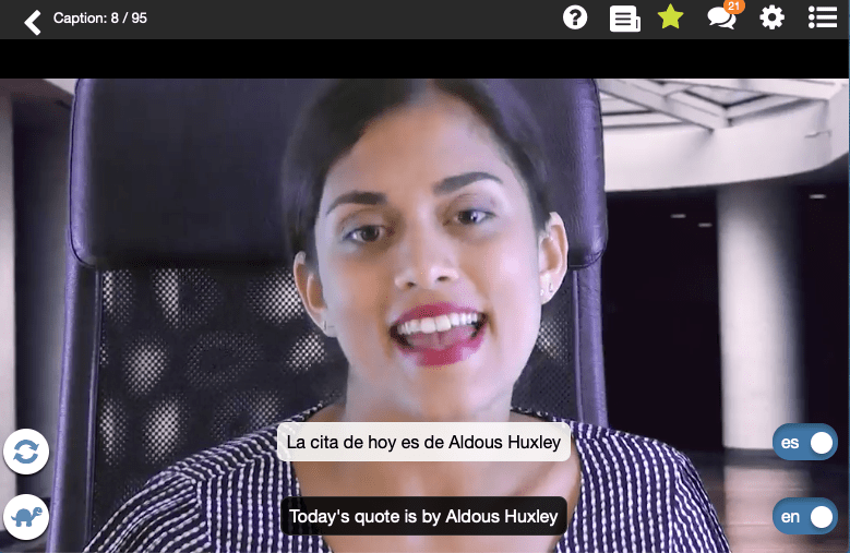- Remarquer les deux boutons (ou « hide or show »), des options sans la traduction, ou/et sans le sous-titrage pour progressivement et naturellement passer Ă la comprĂ©hension naturelle d’une vraie conversation. Super pratique !