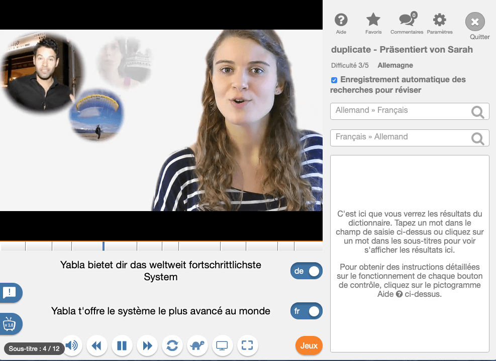 Travailler une vidĂ©o avec Yabla est un plaisir. Plaisir de la dĂ©couverte, plaisir d’une immersion avec des vrais natifs et leur culture et plaisir encore de manipuler la vidĂ©o en toute libertĂ© (j’arrĂȘte, je reprends, je mets en continu, je change de vidĂ©o, je ralentis…). Les rĂ©glages et options sont complĂštes et certaines trĂšs originales et astucieuses pour un confort maximum. Le vrai truc qui marche pour l’apprentissage d’une langue, c’est quand l’on ne s’ennuie pas et c’est le cas avec Yabla!