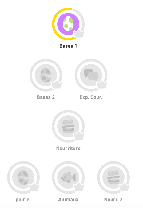 Duolingo est en mode linéaire, il faut donc compléter les leçons pour débloquer les suivantes. Elles sont regroupées par thèmes et surtout axées sur l’apprentissage de vocabulaire à l’aide d’images, textes et sons dans un mode « flashcard » avec une évaluation pour chaque mot.