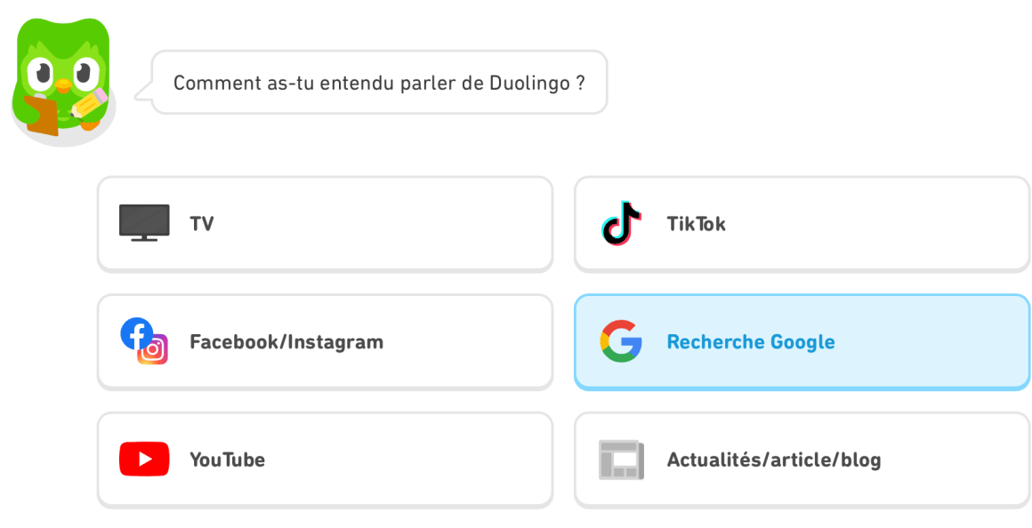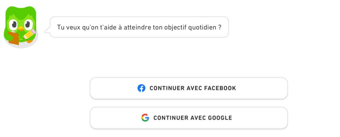 Il est recommandé de créer un compte pour avoir un suivi de progression. Duolingo propose aussi une version payante. Préférer l’inscription mail anonyme aux options faciles et tentantes de Google et Facebook-Meta. Un conditionnement troublant pour l’inscription d’enfants en raison de l’utilisation massive des données personnelles de ces GAFAS. Seul Google comme moteur de recherche est d’ailleurs mentionné dans les questions « comment vous nous avez connu ? » et l’univers proposé autour de Duolingo doit faire réfléchir les parents.