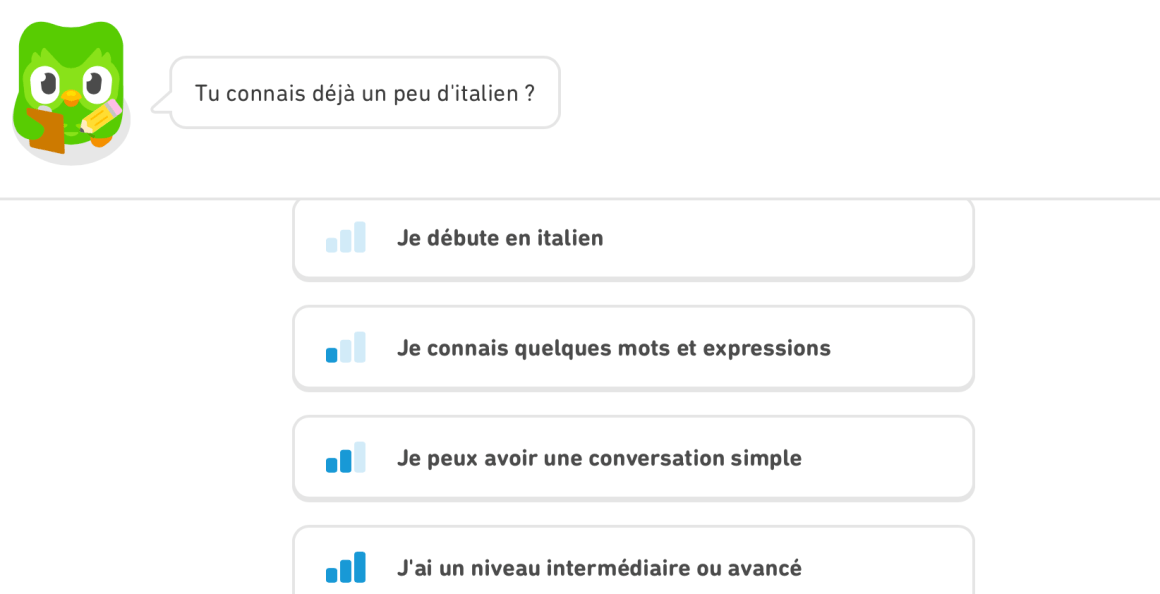 Une étape, le choix entre un test de niveau ou le démarrage from scratch. Si vous avez déjà des connaissances dans la langue choisie, le test permettra de démarrer à un niveau moins fastidieux que celui de base (ne faites pas l’erreur).