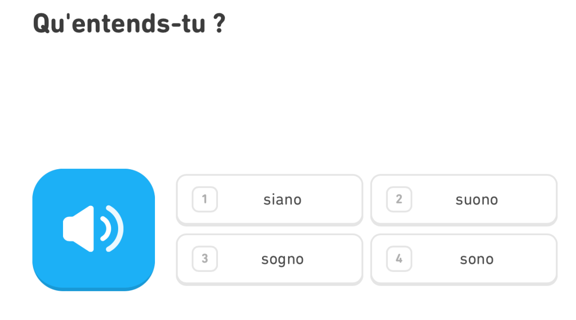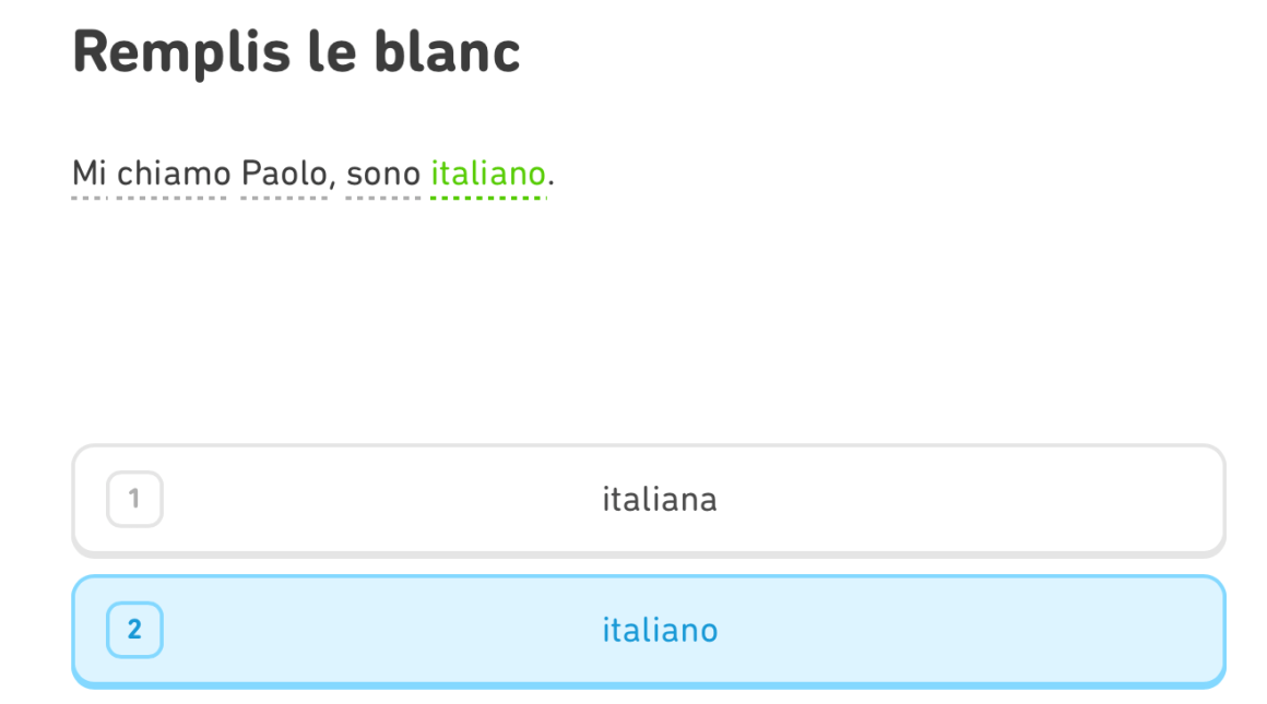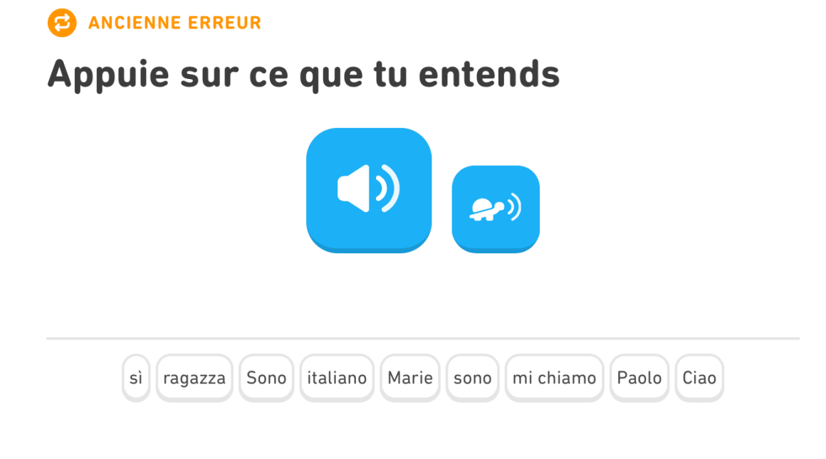 Tout est prémaché et en mode application avec boutons à cliquer dans une série d’exercices qui font un peu trop appel à une vision écrite de la langue. Si le style et rythme sont compréhensibles pour des enfants, les adultes trouveront rapidement l’exercice un peu poussif. Beaucoup de manips avec les phrases ralentissent le’ rytme’apprentissage. Le choix de Duolingo est aussi de démarrer avec des phrases, bien pour le contexte, mais lent à l’usage.