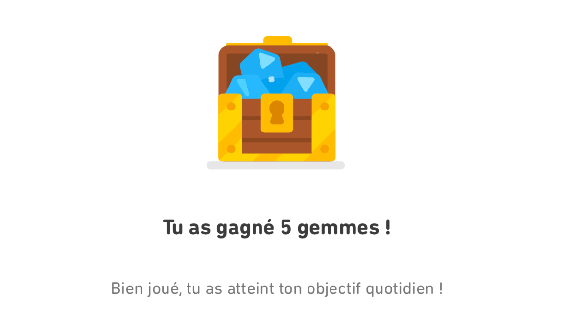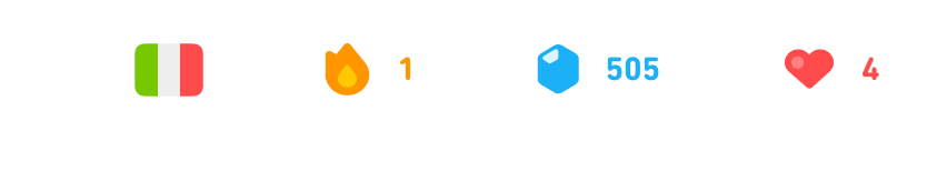 Barre d’infos avec la langue choisie, les séries réussies (streaks), les gemmes (en bleu, anciennement lingots) et les points de vie (coeurs).