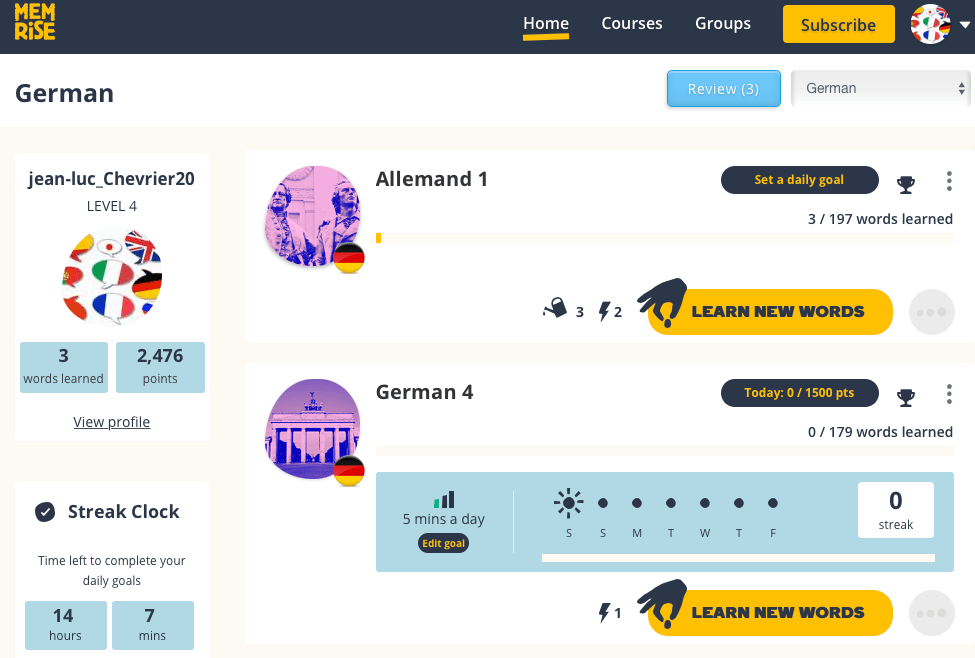 AprÚs avoir choisi sa langue, on recherche librement un cours ou on démarre par celui proposé par Memrise.