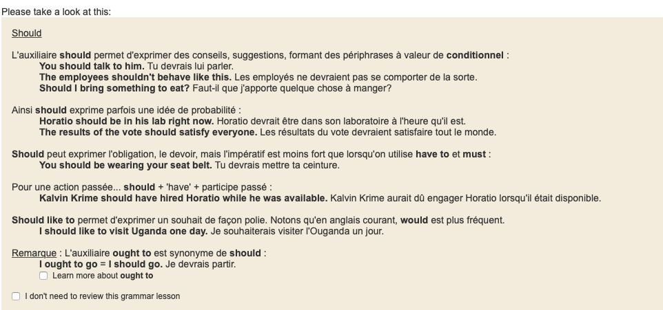 Les pop menus rendent sympathiques le travail et des rappels de rĂšgles sur le point abordĂ© structure votre apprentissage sans tomber dans le « pensum ».