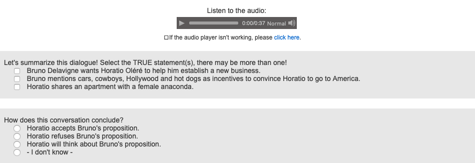 Vous rĂ©flĂ©chissez longuement Ă chaque rĂ©ponse et réécoutez les dialogues pour ĂȘtre sĂ»r et vous rĂ©pondez aux questions. Votre pourcentage de rĂ©ponse sera meilleur et vous serez fier et satisfait, les statistiques sont bonnes. Vous ĂȘtes un bon français, fier de ses notes.