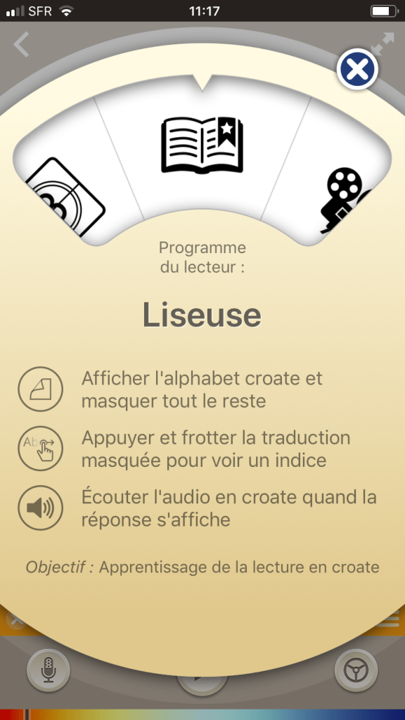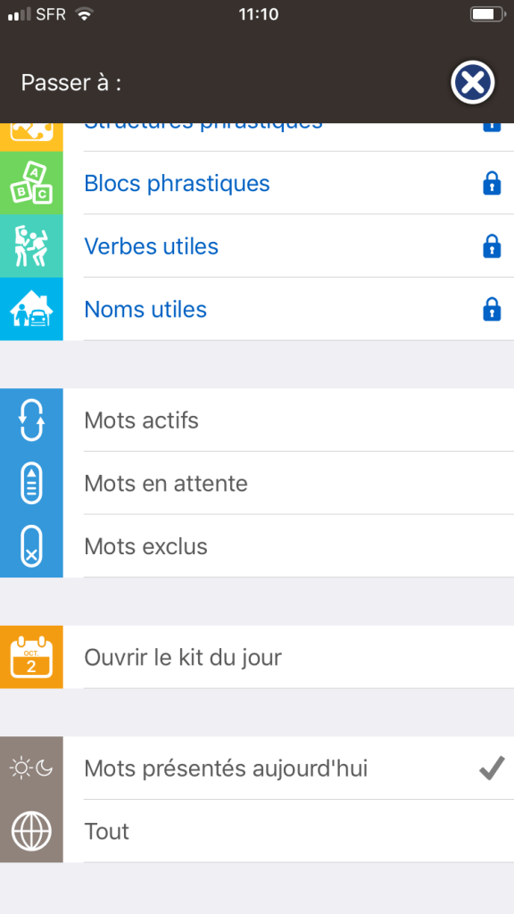 Pour l’Ă©tude, le mode manuel utilise le doigt pour avancer ou reculer et celui automatique en appuyant sur la flĂšche du bas. Les mots reviennent Ă l’infini jusqu’Ă votre mĂ©morisation. Ă SAVOIR : la ligne arc-en-ciel du bas sert Ă l’aide du doigt Ă classer le mot ou expression dans une catĂ©gorie comme rĂ©vision frĂ©quente, trĂšs occasionnelle… C’est l’outil de gestion de votre base de mots et qui conditionnera votre travail futur.
