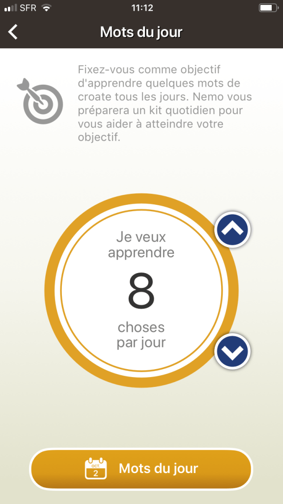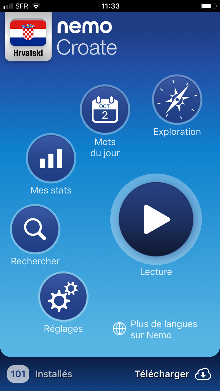 Nemo, c’est un simple « flashcard » sur mobile qui permet d’Ă©couter, de lire, comprendre et rĂ©viser des packs de mots. Existant pour plus de 30 langues, il permet aux dĂ©butants d’apprendre les mots ou phrases de base d’une langue pour une premiĂšre communication de base. Vous vous fixer un objectif journalier de mots Ă apprendre.et gĂ©rer votre lexique Ă apprendre. Une option permet de recevoir automatiquement un pack Ă travailler de mots.
