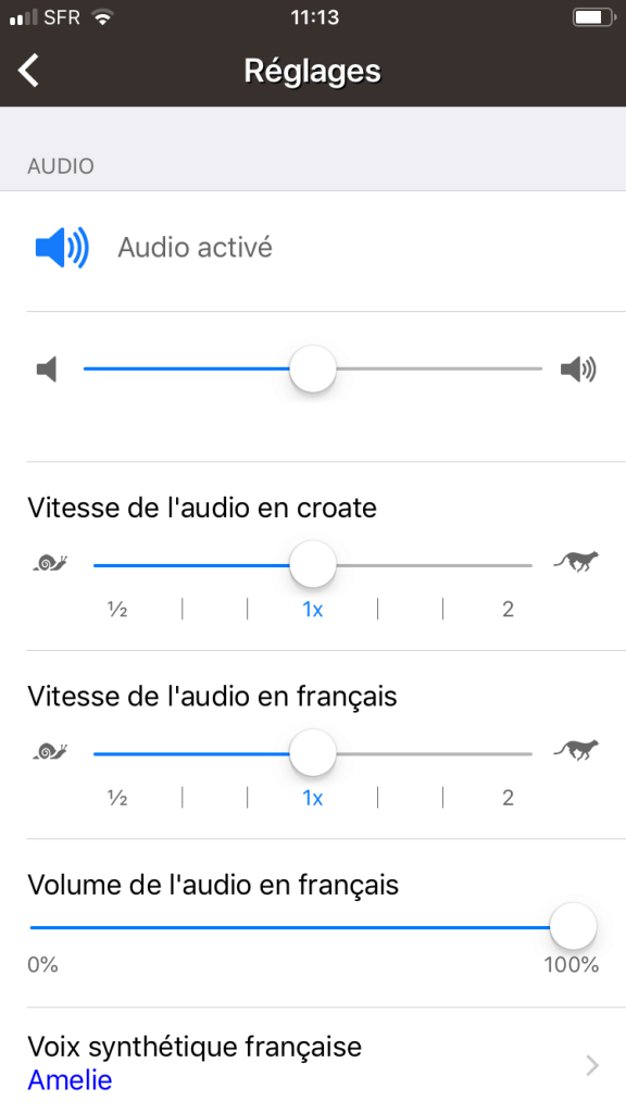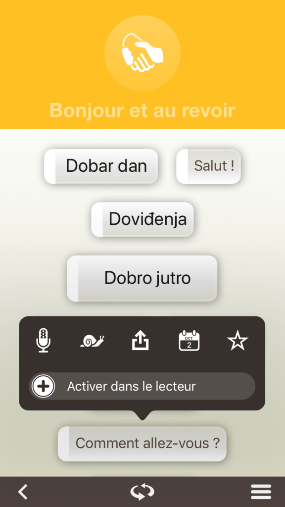 Les interfaces sont multiples, les menus et fonctions aussi en bas, en haut, sur le cĂŽtĂ©… Joliment faite, on peut vite un peu perdu en raison de la richesse des options et l’Ă©parpillement des boutons de commandes dont certains sont un peu cachĂ©s… de travail Ă©purĂ©, un mot, une traduction et une transcription dĂ©file avec un enregistrement possible de votre voix. Bien rĂ©gler la vitesse selon votre niveau… Mais une richesse de fonctions et d’options peu frĂ©quente pour une application. La gestion des mots et leurs interfaces diverses apportent aussi un peu de confusion.