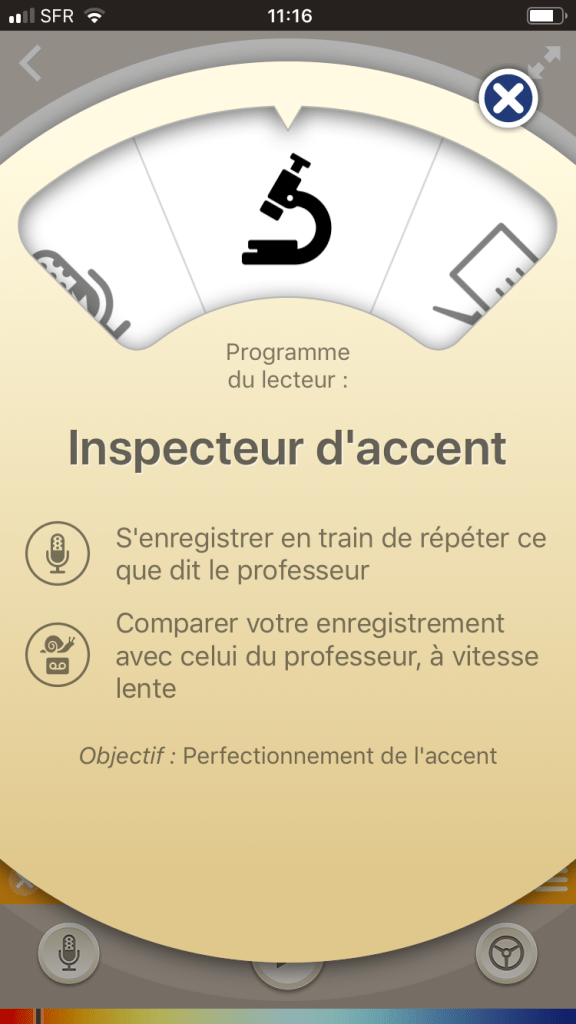 C’est l’emplacement de travail principal avec sa propre interface. On peut agrandir la fenĂȘtre, enregistrer sa voix pour comparer et choisir de nouveaux thĂšmes Ă l’aide du bouton trois barres. Le « volant » en bas Ă droite permet d’accĂ©der Ă la roue des modes de prĂ©sentation trĂšs prĂ©cisĂ©ment dĂ©crites.