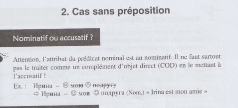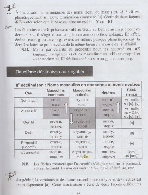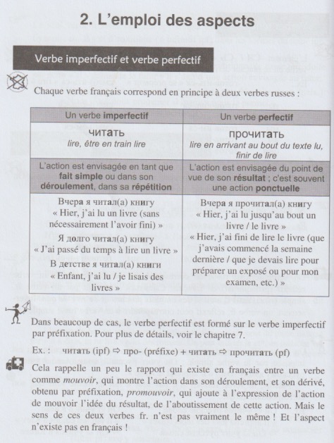 Le premier usage est en fait celui d’un aide-mémoire de la grammaire russe en particulier avec ses nombreux tableaux et ses courts descriptifs de règles. Les titres dans un cadre noir et, bien sûr, l’index des premières pages permettent de trouver rapidement le point de grammaire à revoir. Beaucoup d’informations dans un petit volume !