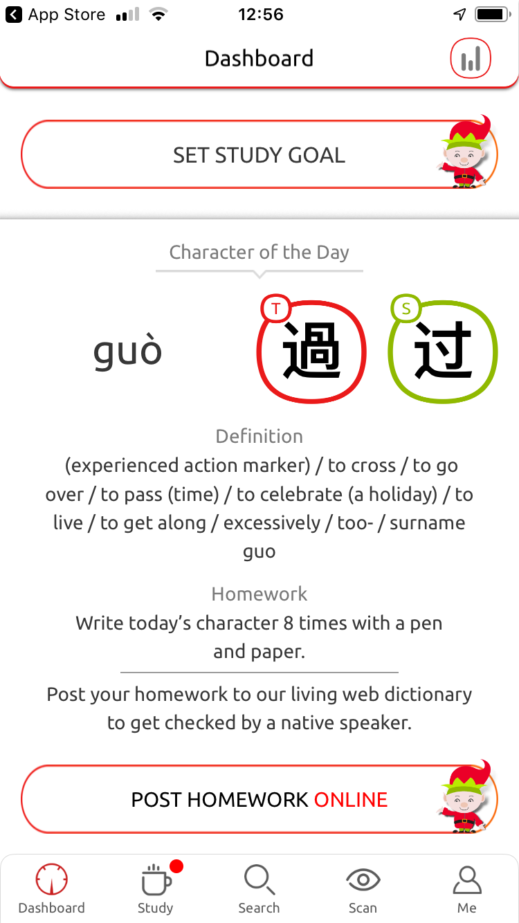 Et le travail commence. Petite manip Ă©ventuelle ici : les mots Ă apprendre (learn) donne le son, caractĂšre et des phrasesâŻ; le « caractĂšre du jour » (dĂ©filement vers le bas) donne une dĂ©finition, un travail Ă faire et l’accĂšs Ă l’interface dĂ©finition/writing/more. Les listes de « study » donne accĂšs Ă la mĂȘme interface contrairement Ă « learn ». Un lien nous semble manquer ici. Agaçant.