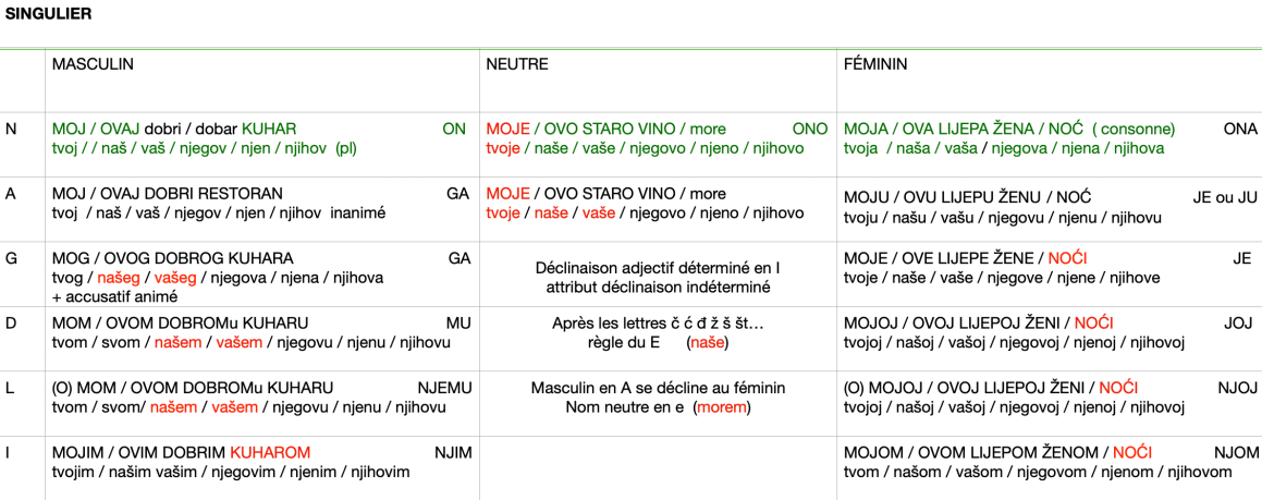 Apprendre Ă dĂ©cliner ensemble les trois (article, adjectif, nom) car les dĂ©clinaisons ont une logique de groupe. Il y a une obligation de marquage du cas en commençant par la gauche (l’article, par exemple) et un principe d’Ă©conomie (si le cas est dĂ©jĂ marquĂ©, on met un marquage faible E ou EN).