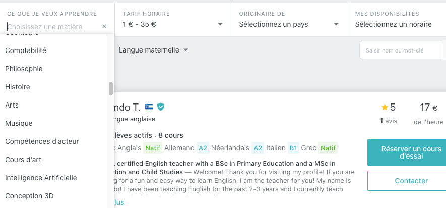 C’est une place de marchĂ© avec des profils certifiĂ©s que l’on pourrait qualifier de professeurs, des « tutors » vĂ©rifiĂ©s (mais pas les compĂ©tences…) et vous aux commandes. Notons que les informations personnelles ne sont pas diffusĂ©es et que chacun fixe ses prix pour 30 minutes de communication.