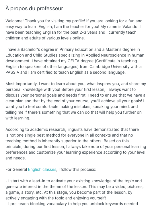 Le service n’ayant pas la vocation de sĂ©lectionner des « professeurs », il s’agit alors pour l’internaute de prendre son temps pour lire et choisir Ă bon escient. Il n’y a pas de conseiller pĂ©dagogique pour vous aider… (sauf l’option demander au site)