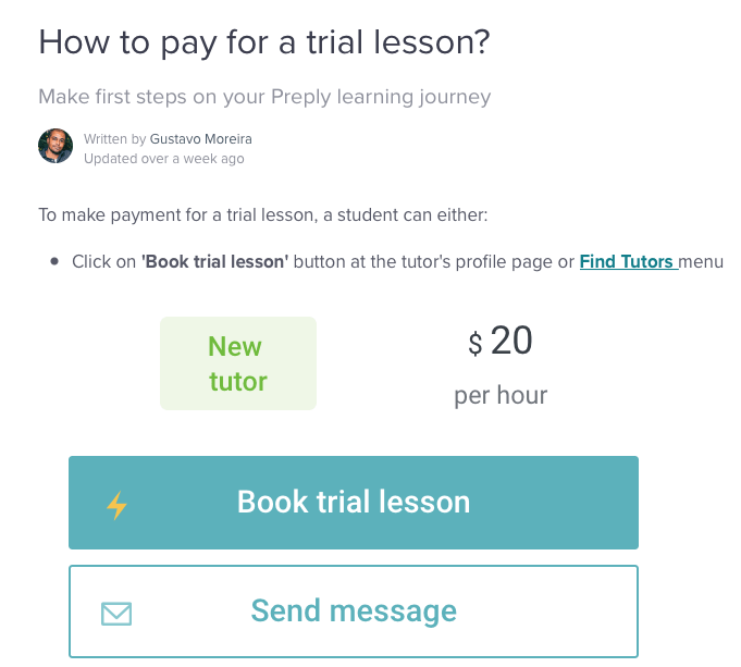 Elles sont Ă dĂ©finir avec votre correspondant (en gĂ©nĂ©ral, les tuteurs ont leur mĂ©thode et habitudes, car il s’agit ici de formateurs et non pas de simples correspondants). D’autres sites proposent des professeurs sĂ©lectionnĂ©s en nombre rĂ©duit par le site ce qui n’est pas le cas chez Preply.