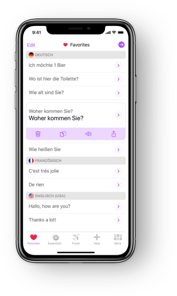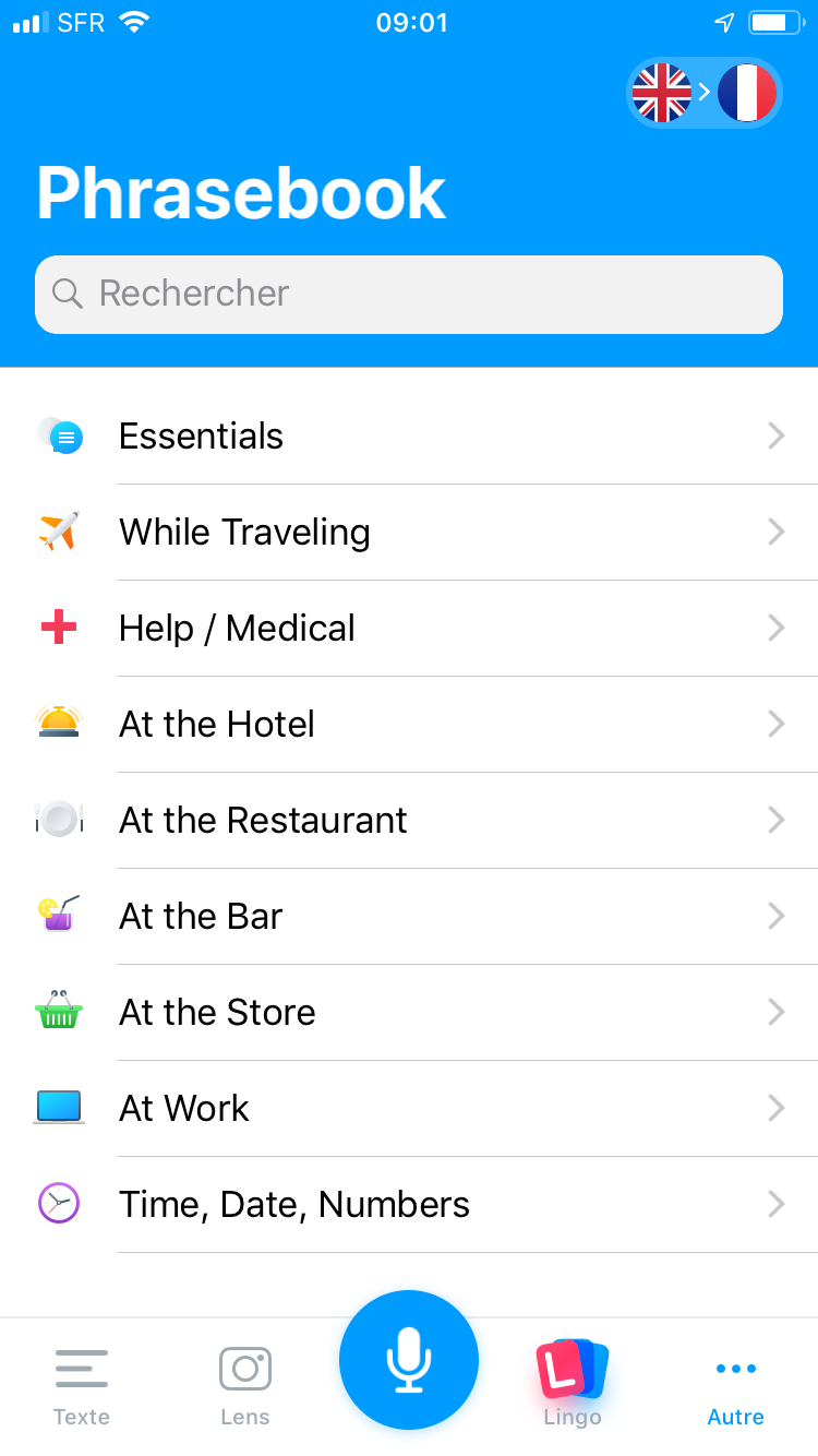 Avec « essentials » le vocabulaire de base, voyage, celui spĂ©cialisĂ©, on trouve dans aide et plus des sĂ©ries thĂ©matiques pratiques en bas de mobile en appuyant sur le petit coeur en haut et Ă gauche pour accĂ©der Ă l’interface « favori ». Pas la fonction la plus ergonomique du truc.