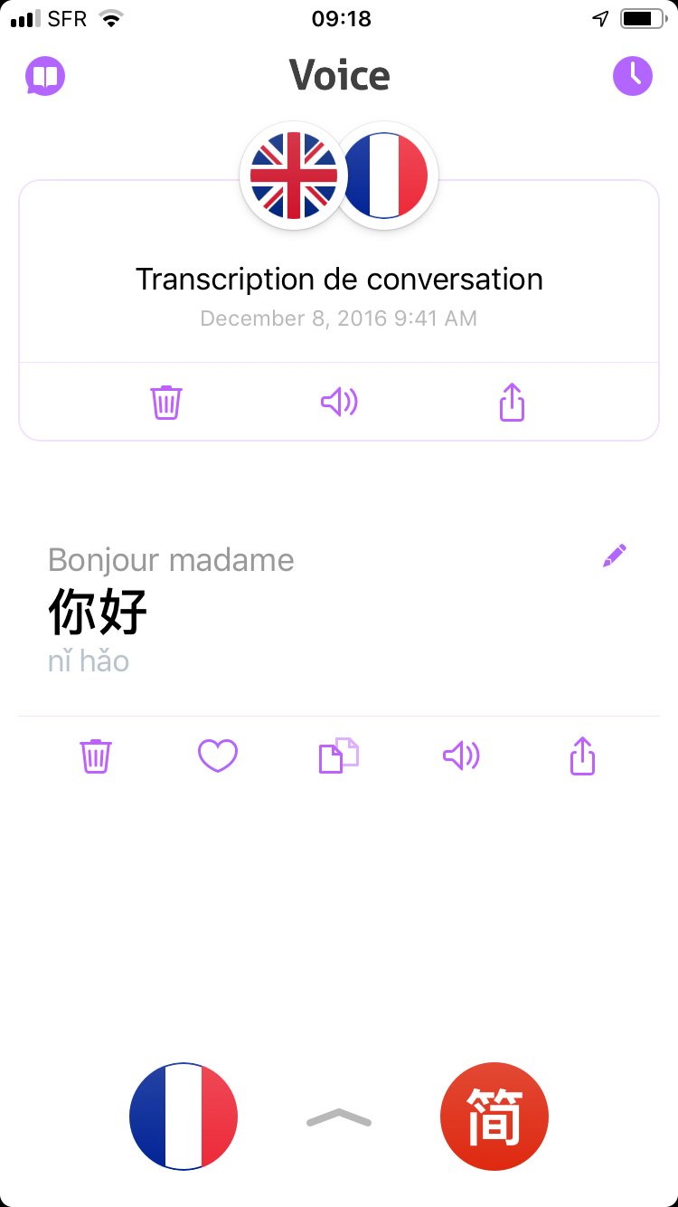 Il suffit d’appuyer sur les drapeaux pour changer de langue, taper le texte ou appuyer sur micro et parler. La traduction s’affiche et on peut l’Ă©couter en appuyant sur l’icĂŽne ad hoc. Des sous-menus avec favori, partage ou agrandissement sont disponibles Ă cotĂ© d’ »effacer ». on cherche un peu au dĂ©but mais les fonctions sont nombreuses et pratiques.