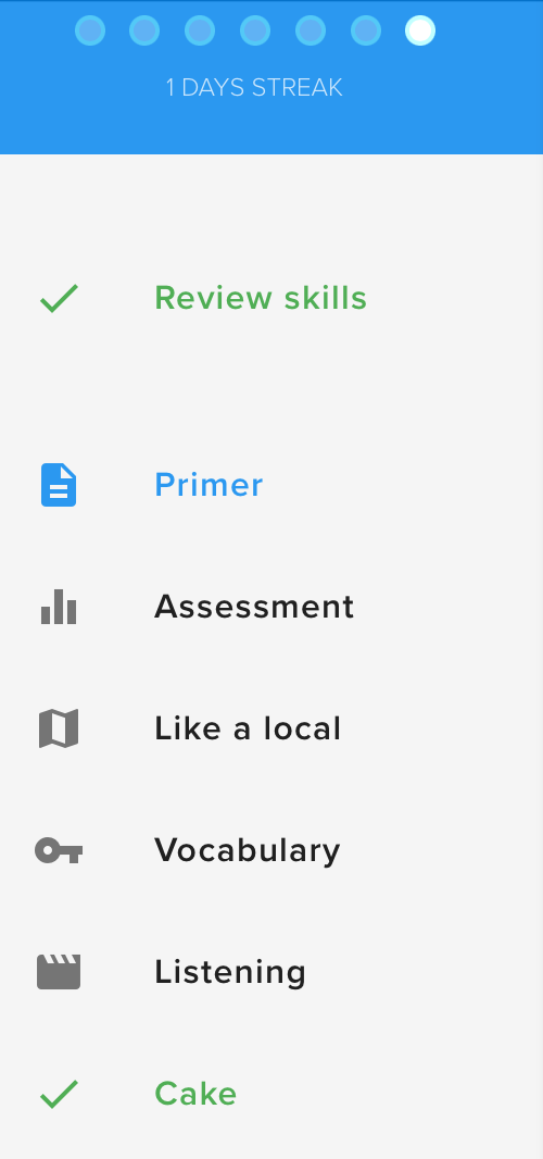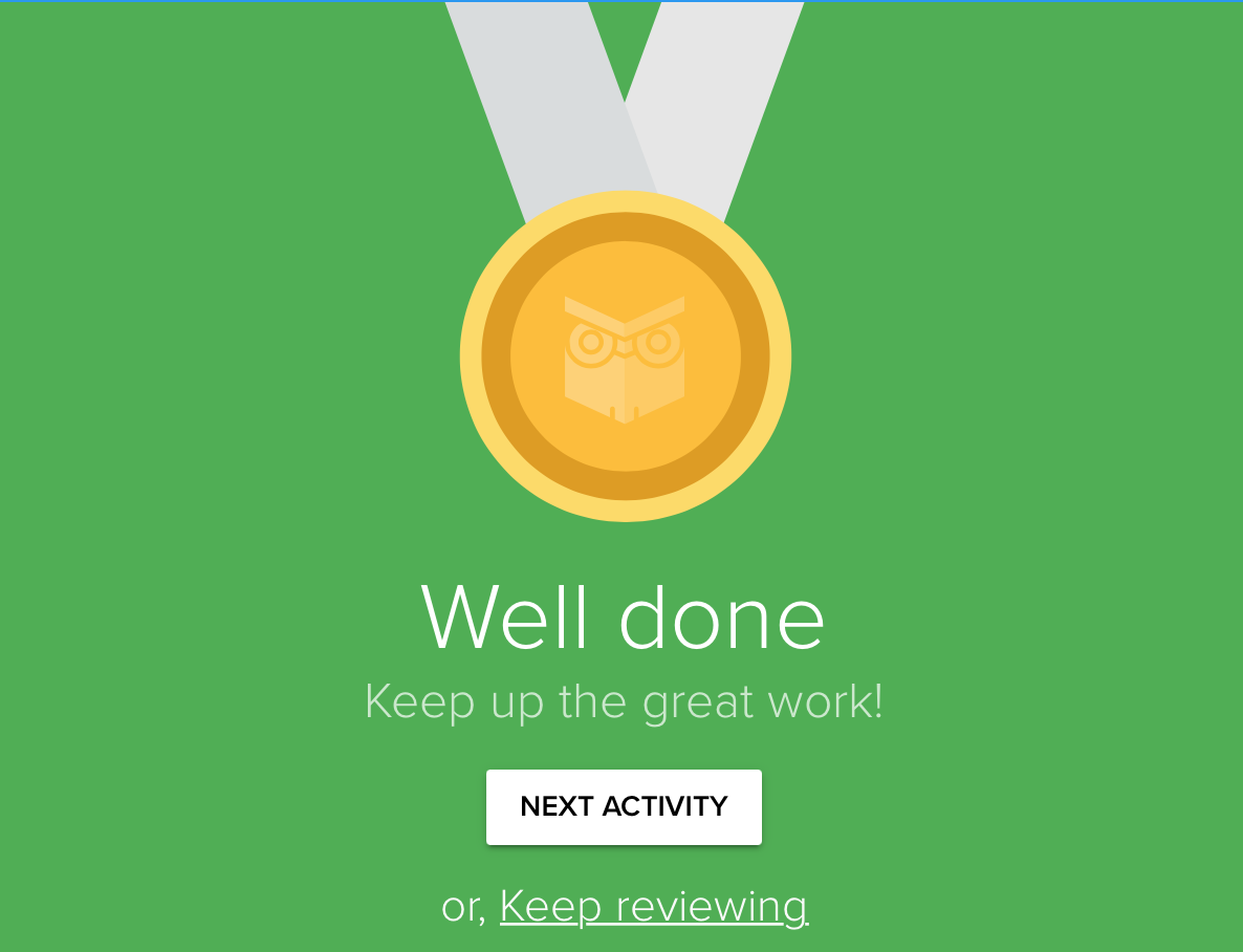 Quand vous avez fini une étape, on vous propose l’activité suivante ou de continuer avec une révision. Chaque élément de la leçon est coché permettant ainsi de savoir où vous en êtes.