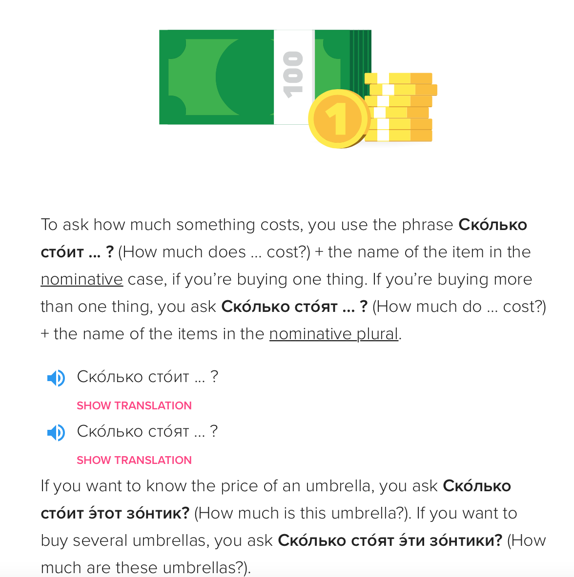 Unlike in English, where the pronunciation of words changes with context, in Russian words are pronounced as they are written. For instance, in English a letter can be pronounced in different ways depending on where it shows up in a word. Consider the two different pronunciations for the letter c in the words cat and race. This difference never happens in Russian