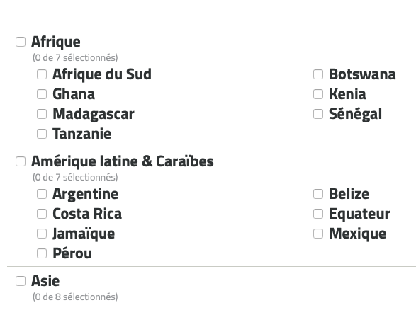 Deux critĂšres de sĂ©lection, le thĂšme du sĂ©jour et la destination. Ces derniĂšres sont orientĂ©es « volontariat » donc a priori pas les Seychelles ou les BalĂ©ares…