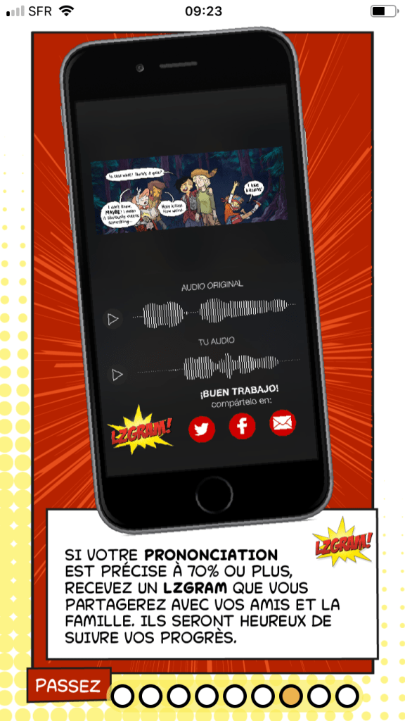 Une trĂšs jolie application issue d’un concept dĂ©jĂ connu, la lecture de BD pour booster la motivation, mais qui rapidement a ses limites pour un strict apprentissage des langues. La premiĂšre est le nombre de mots cumulĂ© appris avec chaque BD. Le vocabulaire n’est pas vraiment le point fort de la bande dessinĂ©e par essence avec une syntaxe plutĂŽt pauvre et un lexique travaillĂ© hyper restreint. La seconde est l’usage terrainâŻ; les « doigts dans le nez » ou les expressions « populaires » ne sont peut-ĂȘtre pas l’urgence Ă apprendre et Ă rĂ©utiliser dans la vie courante. « Bonjour, je suis le commandeur du second quadrant galactique » ne s’utilise pas partout et souvent…