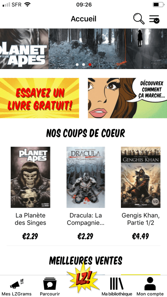 Un choix Ă©clectique et sympathique de BD internationales vous attend ensuite avec des critĂšres de recherche intelligents. Un petit descriptif et une « preview » permet de faire son choix (on achĂšte ici Ă la piĂšce).