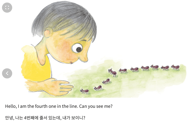 Ils se présentent sous forme de successions d’images avec deux options, la lecture ou l’écoute page par page. Selon les traducteurs bénévoles, on pourra les lire dans deux langues comme ici avec l’anglais et le coréen :