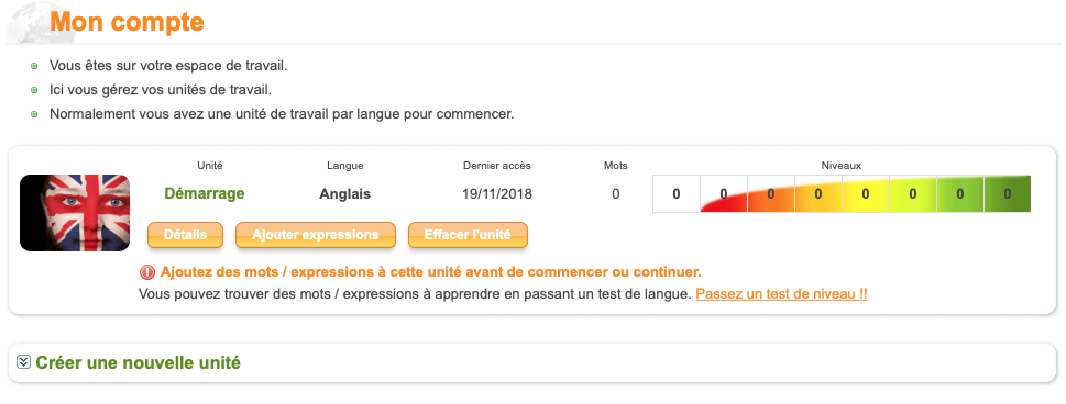 On organise son travail soi-mĂȘme. Il faut d’abord crĂ©er un compte (bien noter le lien, car c’est la porte d’entrĂ©e de votre travail) et des unitĂ©s de travail. On ajoute ensuite dans ces derniĂšres des listes (avec le bouton ajouter) qui permettent de crĂ©er une session d’apprentissage avec son vocabulaire sĂ©lectionnĂ©.