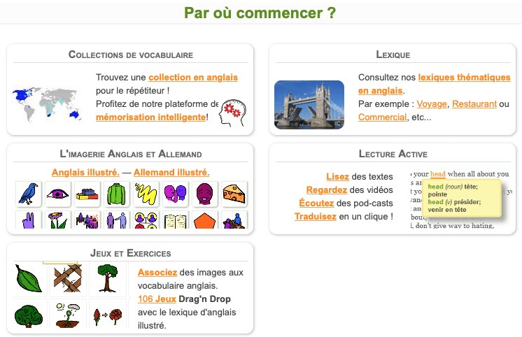 Un aspect intĂ©ressant est la richesse des ressources disponibles avec en vrac des lexiques illustrĂ©s, des liens radios en anglais, des textes d’anglais des affaires, des services de traductions, des listes de vocabulaires (4000), guide de survie en voyage…
