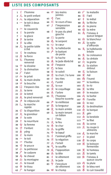 Curieusement l’ouvrage dĂ©bute avec ce chapitre au nom un brin contradictoire puisqu’il ne s’agit pas d’apprendre Ă Ă©crire (pas de descriptif ici de traçages ou de rĂšgles de base) mais d’Ă©tudier un « lexique » de caractĂšres les plus frĂ©quents qui servent Ă constituer d’autres « mots ». Ces clĂ©s ont une valeur sĂ©mantique le plus souvent et aident Ă la comprĂ©hension d’un caractĂšre inconnu. Elles peuvent aussi avoir une valeur graphique ou phonĂ©tique. C’est un Ă©lĂ©ment important pour progresser et « lire » plus facilement le mandarin.