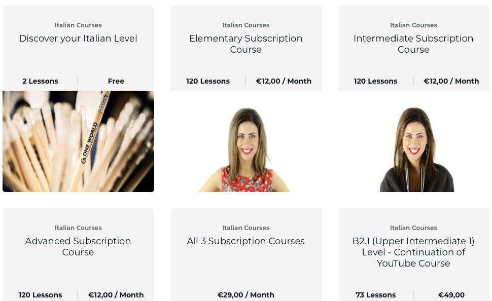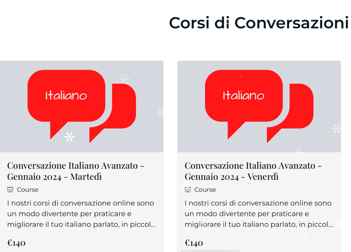 L’Ă©cole propose une gamme variĂ©e de produits comprenant des cours en ligne de tout niveau s’appuyant sur des vidĂ©os, des cours de groupe ou individuels, des sĂ©jours en Sardaigne ou encore des groupes de conversations. Si l’italien est le fondement de l’Ă©cole, d’autres langues sont enseignĂ©es avec les mĂȘmes mĂ©thodes.