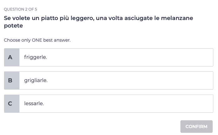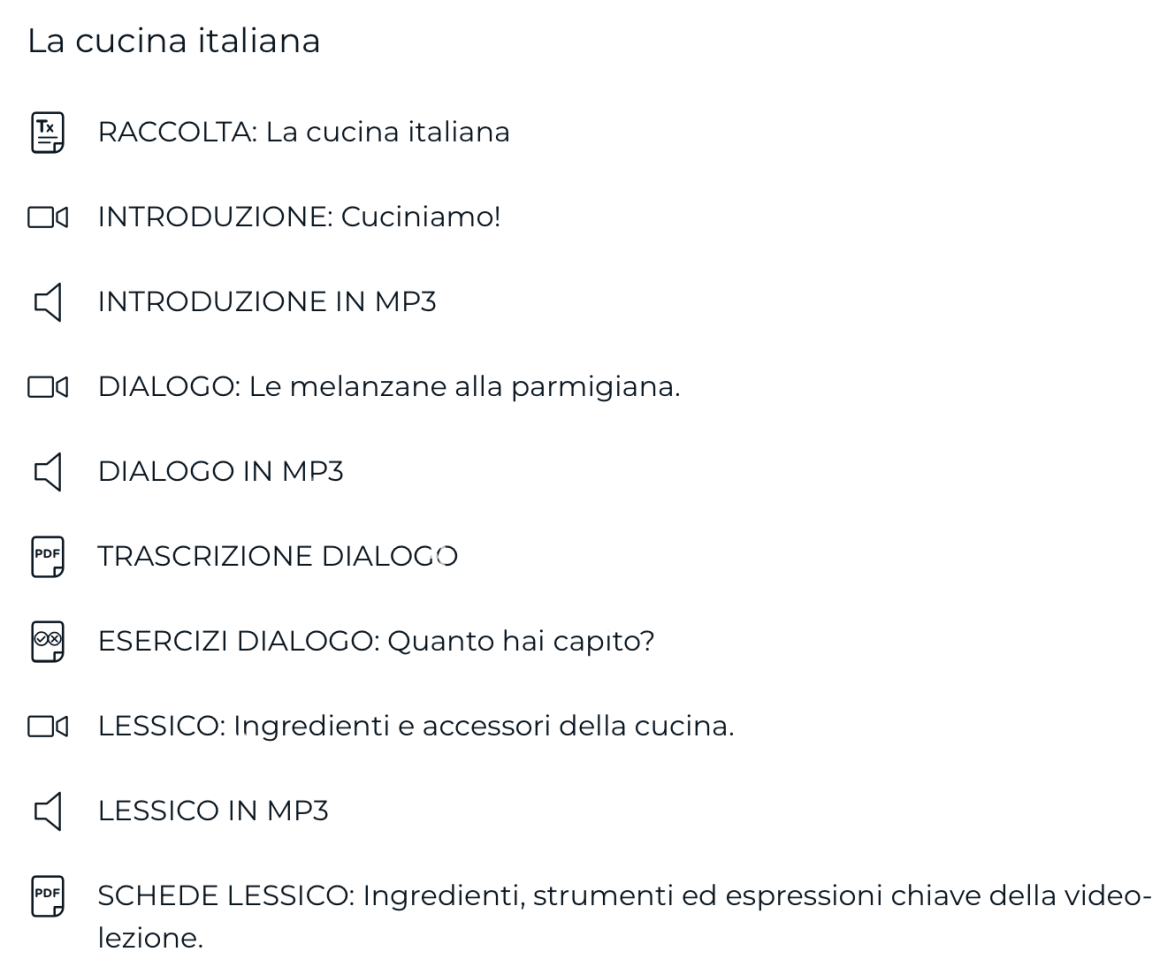 Les cours vidĂ©os sont clairs (mais assez pointus pour un vrai dĂ©butant) et abordent tous les aspects d’une langue. Ergonomie complĂšte et agrĂ©able mais c’est la qualitĂ© de la vidĂ©o avec sa cuisiniĂšre en chef qui donne un charme particulier et Ă l’italienne Ă ces cours.