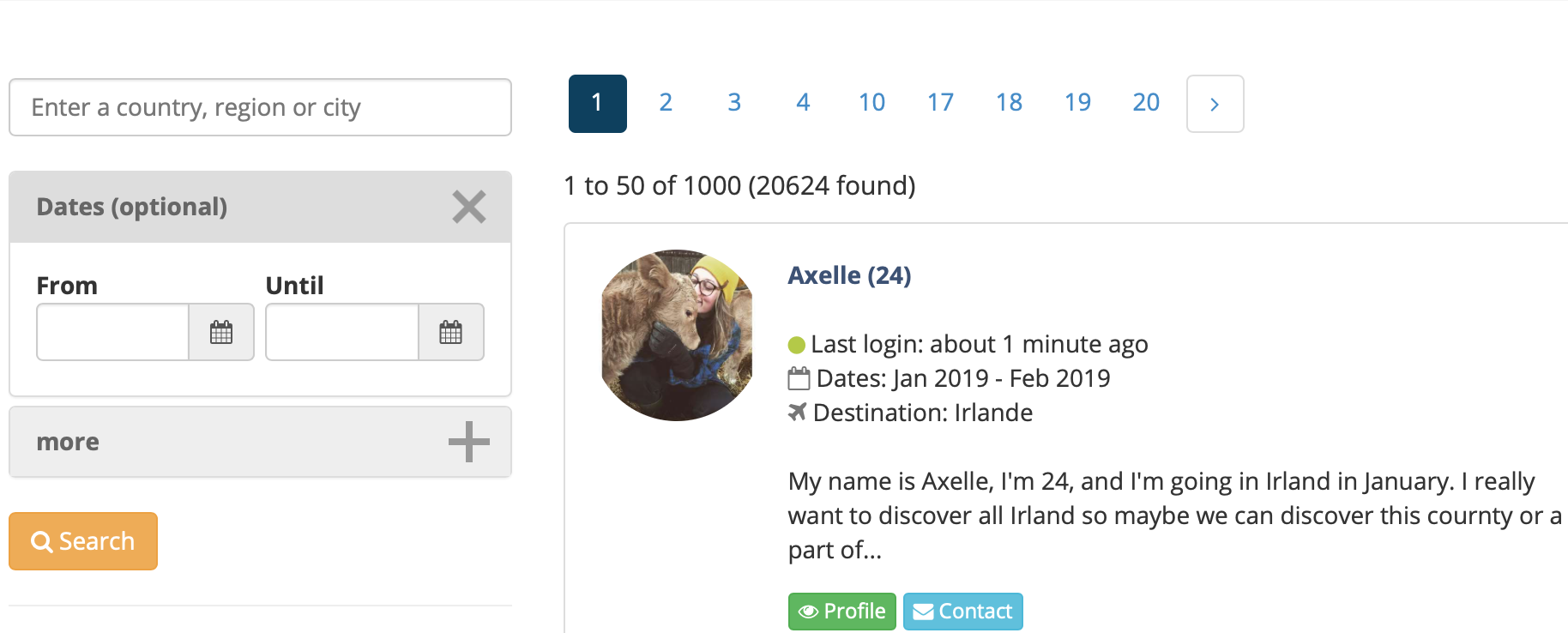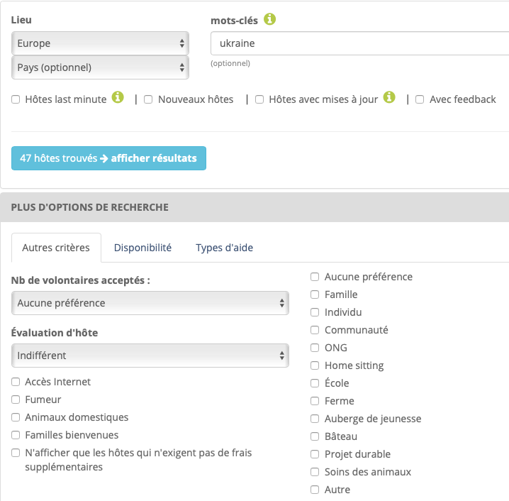 La recherche permet de consulter et de contacter les hÎtes. Le principal critÚre est géographique, mais les options permettent de mieux cibler ses attentes.