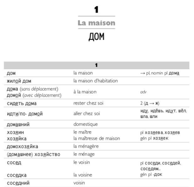 Son classement thĂ©matique en 17 sujets permet l’apprentissage des mots dans un contexte avec le soulignement de la place de l’accent tonique (trĂšs important en russe et non marquĂ© normalement), la traduction et une colonne spĂ©ciale pour les particularismes comme un gĂ©nitif ou un pluriel Ă  part ou la conjugaison spĂ©ciale d’un verbe. Les pages sont trĂšs claires (et non surchargĂ©es) et les caractĂšres trĂšs lisibles et la colonne « exception » est une merveilleuse trouvaille.