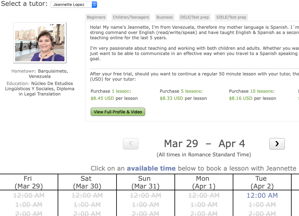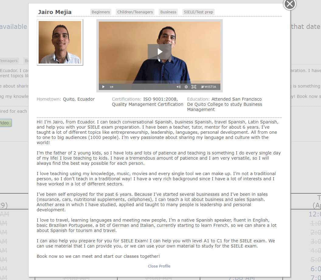 Une inscription est nĂ©cessaire pour accĂ©der aux profils de profs et aboutir Ă la page des profils. Un tout simple pop menu permet d’afficher successivement les profils courts, mais avec l’essentiel, le rĂ©sumĂ©, les prix et les plages horaires disponibles pour une premiĂšre sĂ©lection. Un clic pour accĂ©der au profil complet avec, en bonus, une vidĂ©o (trĂšs bon outil pour choisir un profil qui vous branche ou un accent). Rapide et complet, mais le pop menu sera vite un handicap avec l’accroissement de nombre de profs et une version « pavĂ©s » ou vignettes serait prĂ©fĂ©rable pour l’avenir…