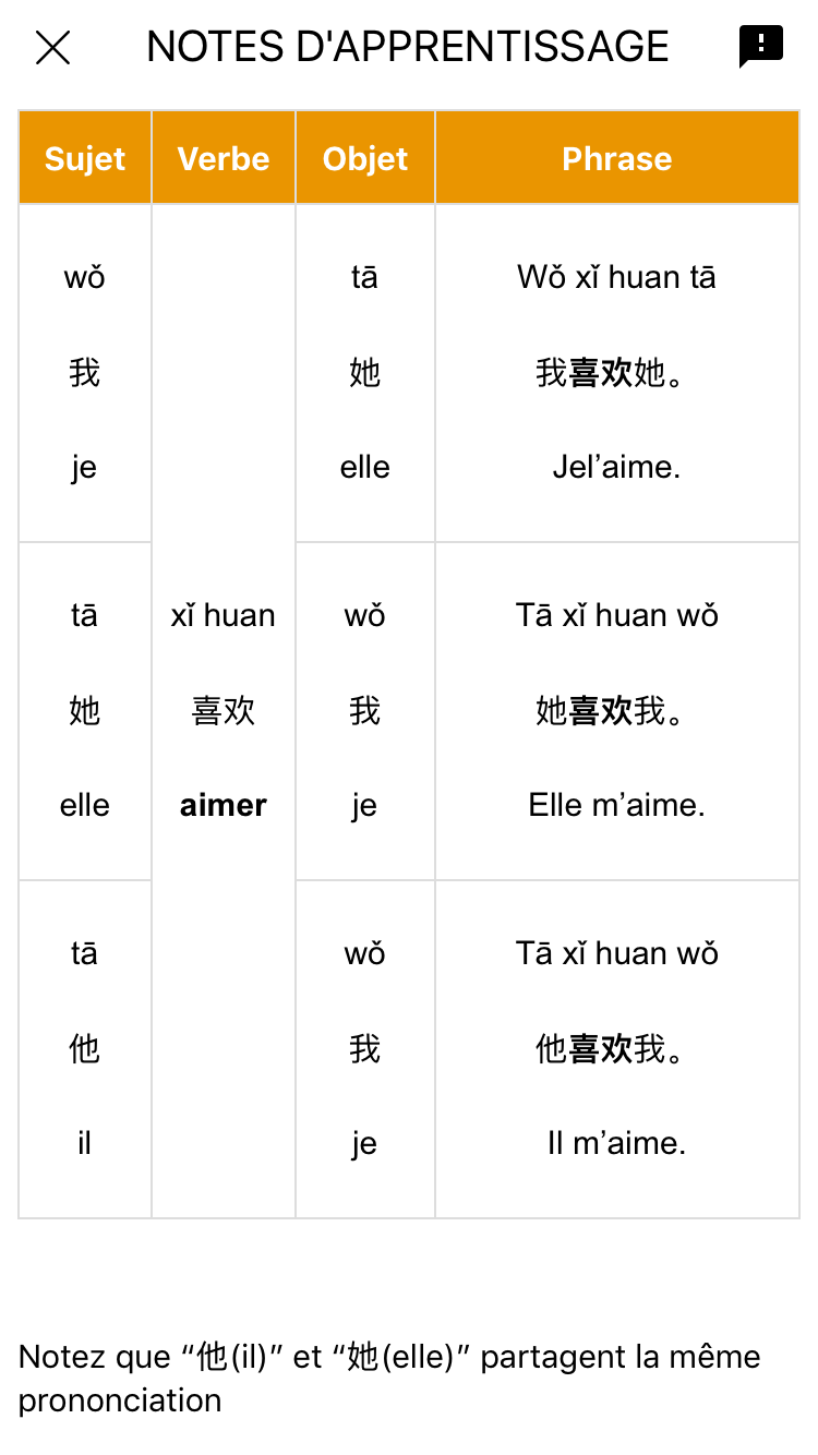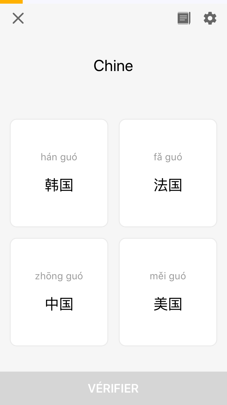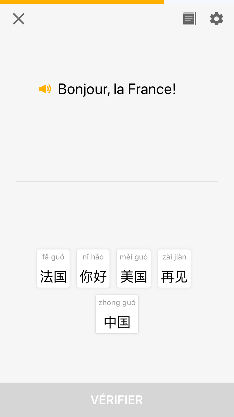 Mais Lingodeer le sait trĂšs bien (il n’aurait pas pu avoir de succĂšs facile pour son appli en ne le faisant pas) et propose un rĂ©glage pour pouvoir ne plus l’afficher. Ne parlons pas de l’horreur de conserver le pinyin et la traduction seules, degrĂ© 0 de l’apprentissage du chinois…