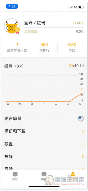Trois menus en bas de mobile : les leçons, la rĂ©vision et son compte complĂ©tĂ©s par un rĂ©glage de langues de travail (dans les trois barres du haut). Minimaliste.